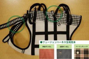 <綿麻生地見本>の<黒地白水玉>を使ったハーネスです。